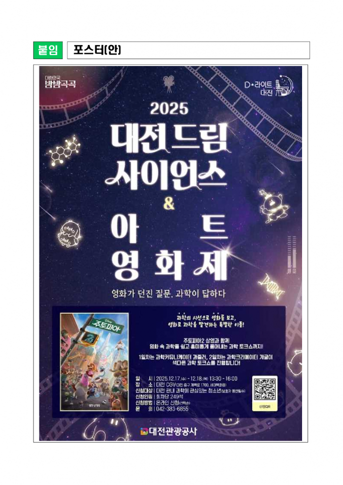 대전관광공사에서 '2025년 대전 드림 사이언스&아트 영화제'에 희망 학생들 대상 과학진로 체험 프로그램을 운영하고자 합니다.