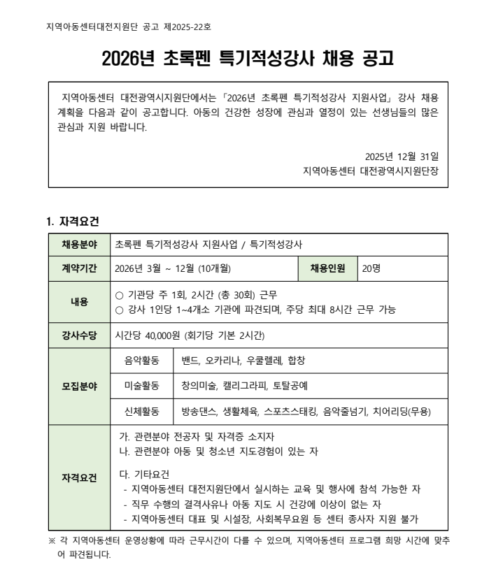 2026년 초록펜 특기적성강사 채용 안내